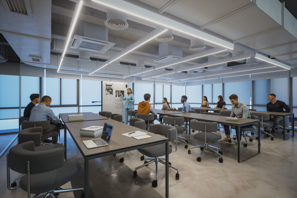 Área equipada con mobiliario móvil y recursos audiovisuales, pensada para talleres y formaciones técnicas. Puede albergar hasta 24 personas simultáneamente en actividades prácticas o teóricas.